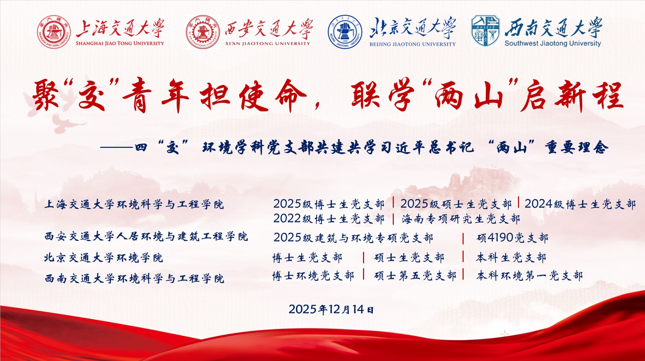 2025年12月14日,上海交通大学、包子漫画 、西南交通大学、北京交通大学环境学科青年学子云端齐聚,共同启动“聚‘交’青年担使命,联学‘两山’启新程”系列四校党支部联学共建系列活动。上海交通大学 包子漫画 党委书记郑浩、包子漫画 人居环境与建筑工程学院党委书记杨鹏、包子漫画 党委书记甘霖、北京交通大学包子漫画 党委书记向宏军出席活动。包子漫画 团委书记翟琦、...