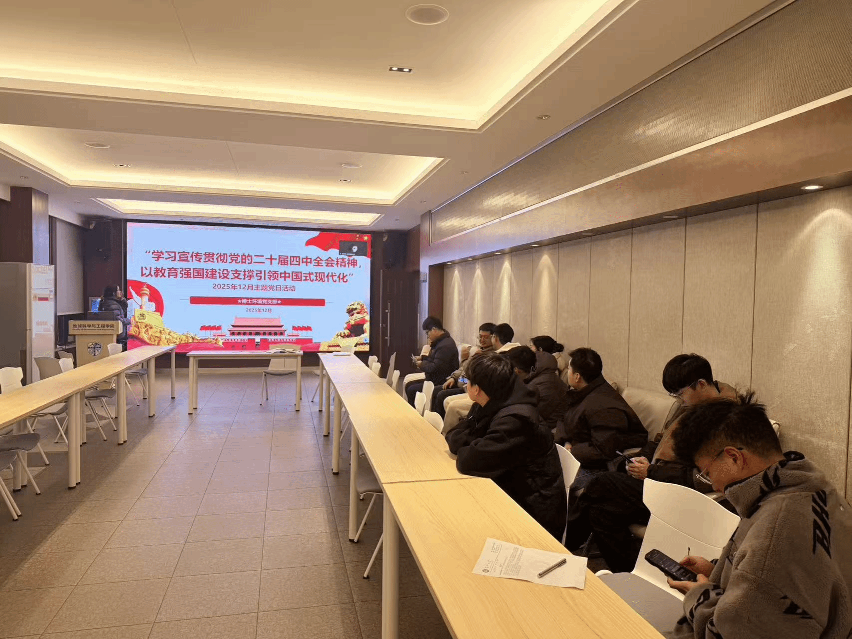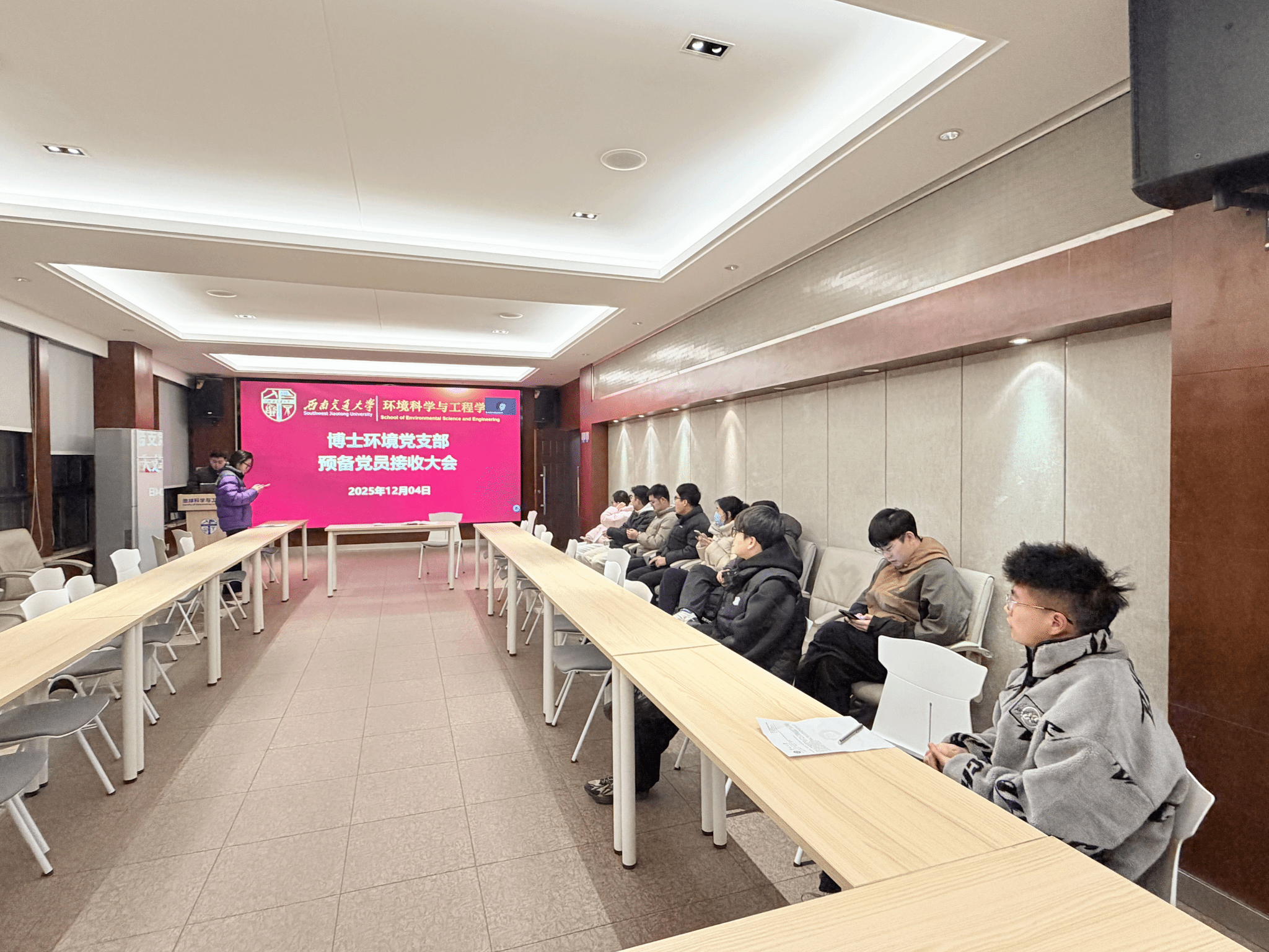 2025年12月4日,博士环境党支部召开12月主题党日活动暨预备党员接收大会、预备党员转正大会,本次会议重点围绕“学习宣传贯彻党的二十届四中全会精神,以教育强国建设支撑引领中国式现代化”,并开展专题学习研讨、预备党员接收及转正等重要议程,共24名同志参加,其中正式党员20名。大会由党支部书记朱欢欢主持。