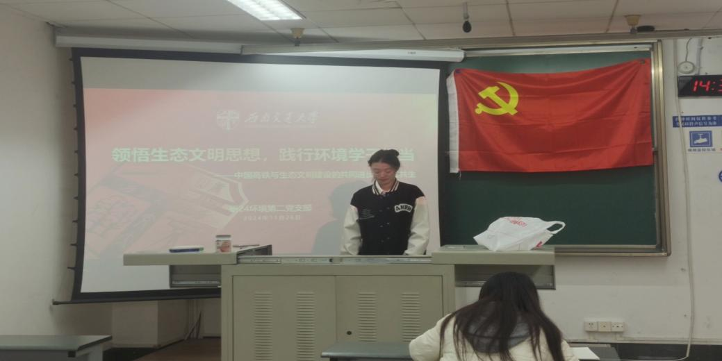 1126日,支部全体同志在支部书记刘艳霞的带领下,共同学习习近平生态文明思想的理论精髓和丰富内涵,深入领悟习近平总书记在生态文明建设中重要指示,同时,学习轨道交通领域近年来对呵护沿线生态的做的加法,切实感受中国铁路的飞速发展。通过学习大会内容和研讨,支部成员不断加强对生态文明建设的理解,深刻认识作为环境学子在生态文明建设中的重要作用,并表示将积极投入到生态文明建设中,为保护生态环境、建设美丽中国贡献力量。
