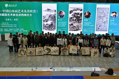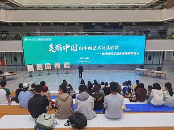 袁艺为同学们作题为《美丽中国一中国山水画艺术及其欣赏》的讲座。袁老师系统介绍了中国山水画的发展历程和各年代的画风特点,并展示了数十幅山水画,与同学们一起鉴赏。现场掌声阵阵,为各位大师和其作品送上同学们的敬意。