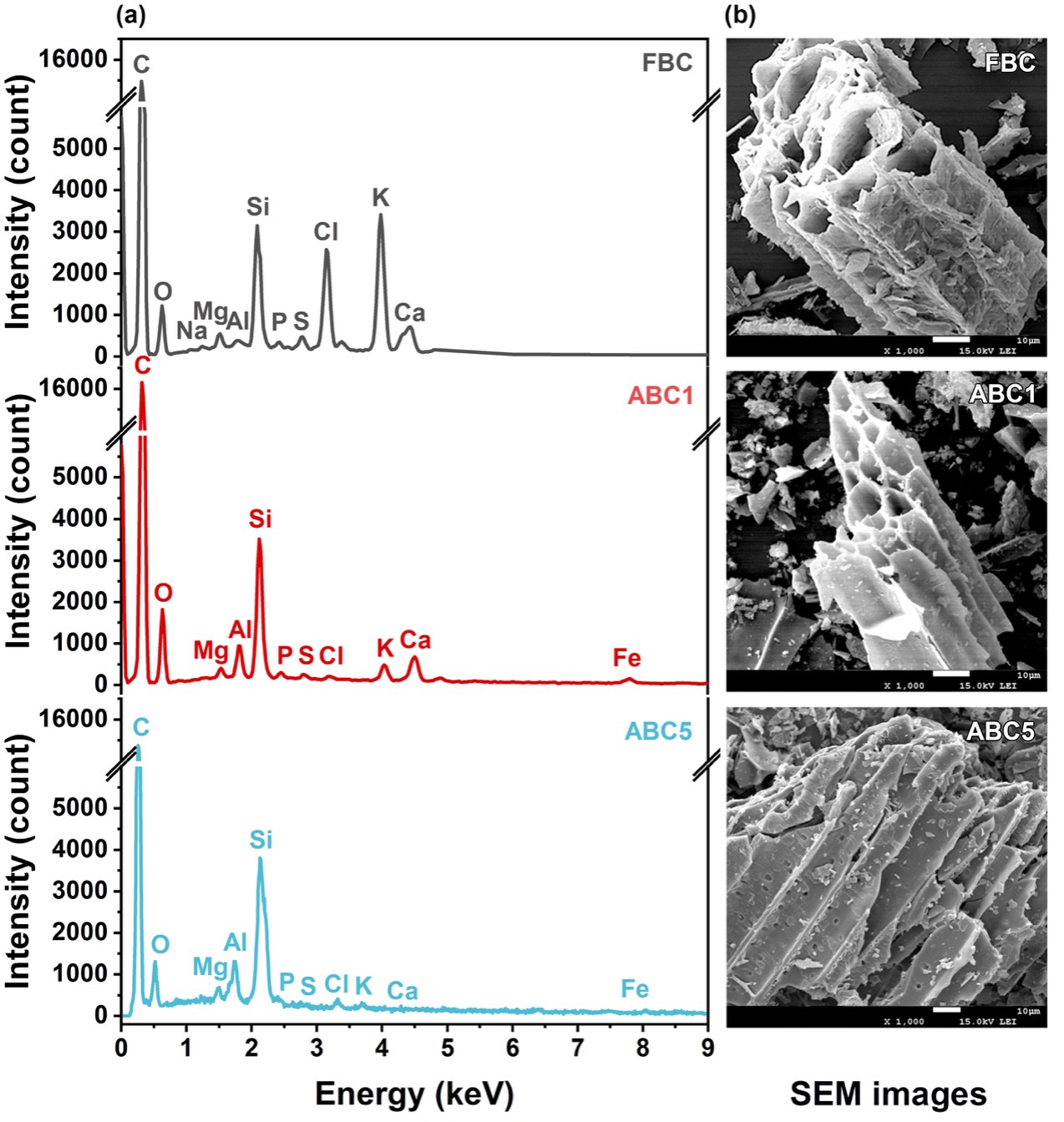图1 新鲜生物炭(FBC)与老化生物炭(ABC)的表面形貌及元素组成分析,(a)能谱分析(EDS);(b)扫描电镜(SEM)