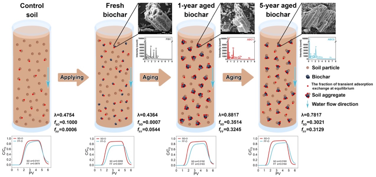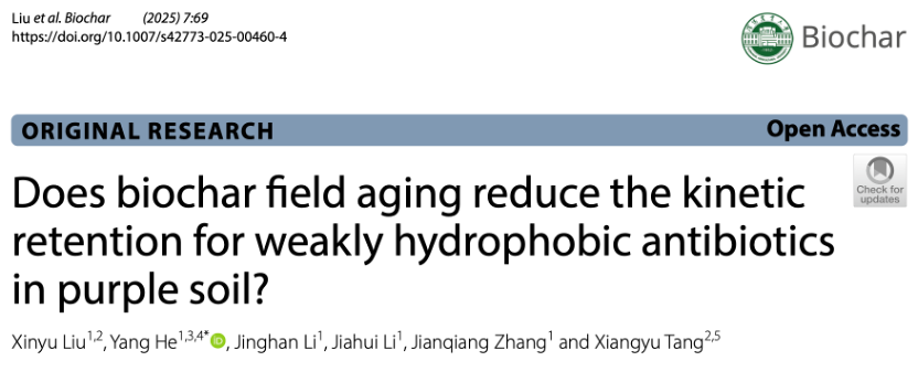 论文详细信息:Xinyu Liu, Yang He*, Jinghan Li, Jiahui Li, Jianqiang Zhang, Xiangyu Tang (2025) Does biochar field aging reduce the kinetic retention for weakly hydrophobic antibiotics in purple soil? Biochar 7, 69