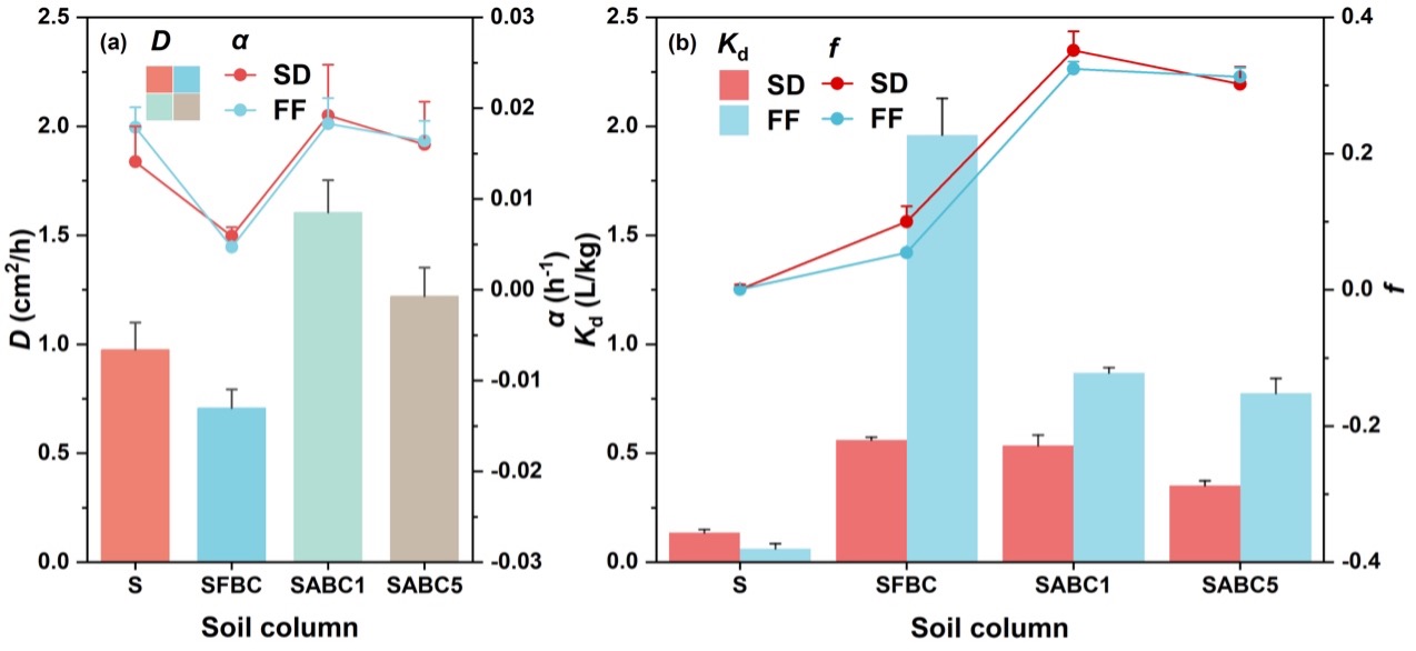 田间老化生物炭(FABC)对弱疏水性抗生素在土壤中的吸附与迁移机制尚不明确。本研究以紫色土中常见的磺胺嘧啶(SD)和氟苯尼考(FF)为目标污染物,对比分析了新鲜生物炭(FBC)、1年老化生物炭(ABC1)和5年老化生物炭(ABC5)的作用效果。通过吸附实验、土柱淋溶及Hydrus 1D模型模拟,探究了生物炭老化对抗生素迁移行为的影响。结果显示,生物炭老化后元素组成显著变化,碳元素含量减少,氧元素含量增加。ABC1因比表面积(SSA)增大和含氧官能团增多,显著提高了SD和FF在土壤中的滞留能力。尽管ABC5的SSA有所下降,但通过增强生物炭-土壤复合体的稳定性(表现为弥散度λ增加,水动力弥散系数D提高),仍能维持长期阻控效果。Hydrus 1D模型模拟显示,平衡吸附位点比例f随老化时间增加,老化过程影响了生物炭的吸附特性。本研究证实,1年老化生物炭对抗生素的阻控制效果最佳,而5年老化后则主要通过调控弥散作用维持阻控效能的长期稳定。这一发现为生物炭应用于土壤抗生素污染阻控提供了重要理论依据。