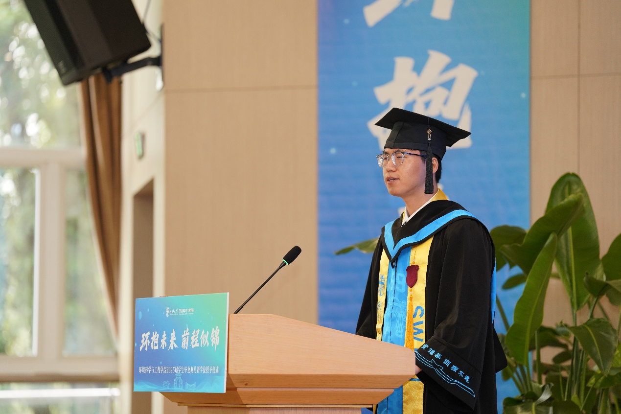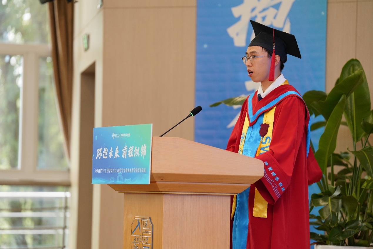 2021级博士生刘欣雨作为毕业研究生代表发言。他向辛勤培育的领导和老师表达了最真挚的感谢和敬意,并分享了三点感受:一是感恩师长,感谢张建强教授等老师用行动诠释师者担当;二是感恩成长,始终秉持奋斗精神和团队精神,用成长面对未来;三是勇担责任,号召毕业生以国家重大战略为坐标,在生态治理与绿色技术前沿传承知行合一的担当,让环境人的科研理想与民族复兴同频共振。