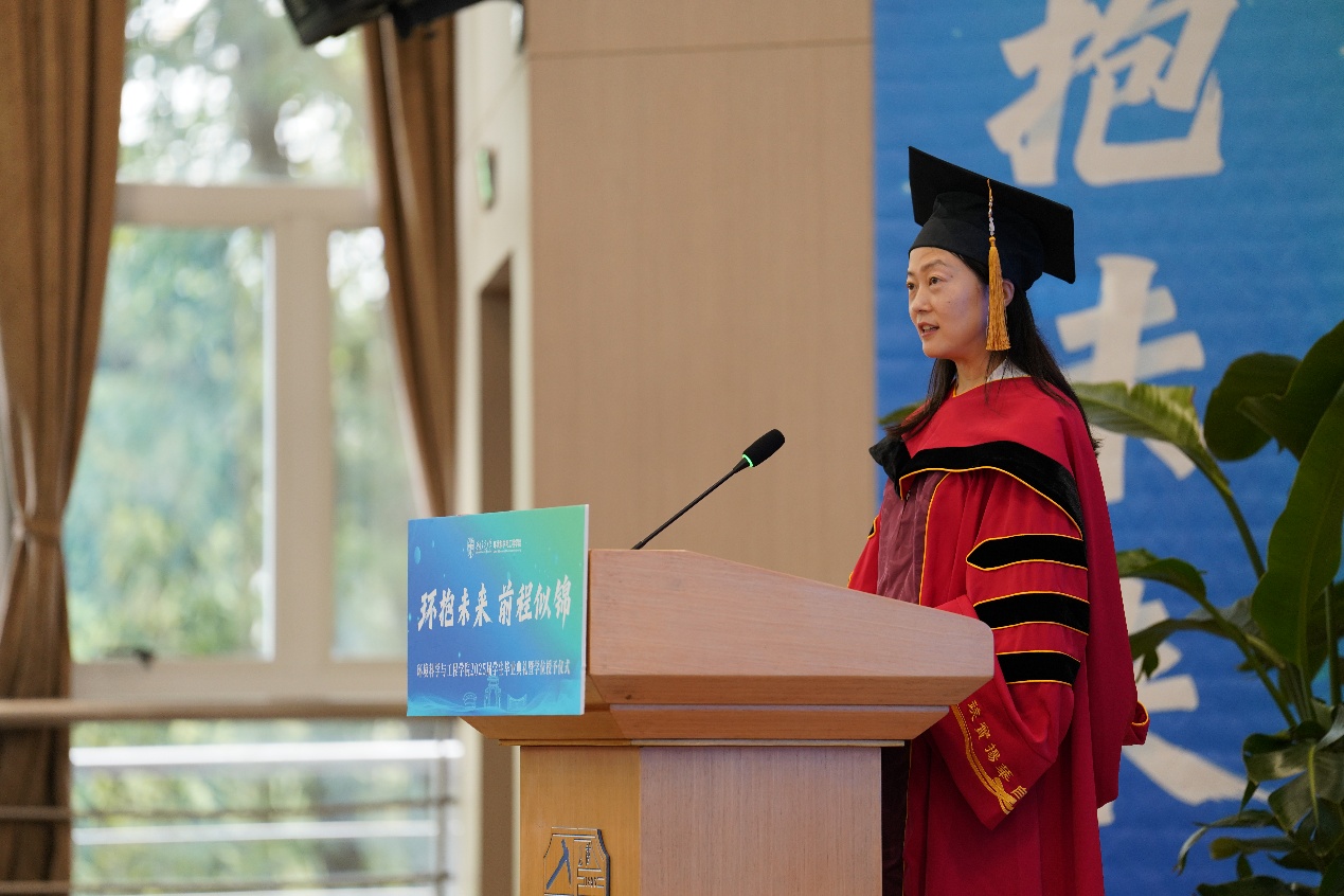 龚正君教授向全体毕业生致以祝贺:蝉鸣盛夏,正是鹏程万里时。她表示,同学们在学术科研、创新竞赛、志愿公益、社会实践等方面都表现优异、成绩突出,更是参与和见证了环境由学科成为独立学院的跨越式发展。学院取得的突破离不开每一位环境学子的奋斗。