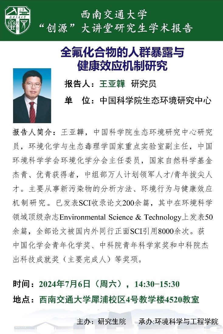 2024年7月6日,中国科学院生态环境研究中心研究员、环境化学与生态毒理学国家重点实验室副主任、中国环境科学学会环境化学分会主任委员、国家杰出青年科学基金获得者王亚韡研究员应邀来访西南交通大学,在犀浦校区X4520作题为“全氟化合物的人群暴露与健康效应机制研究”的学术报告。