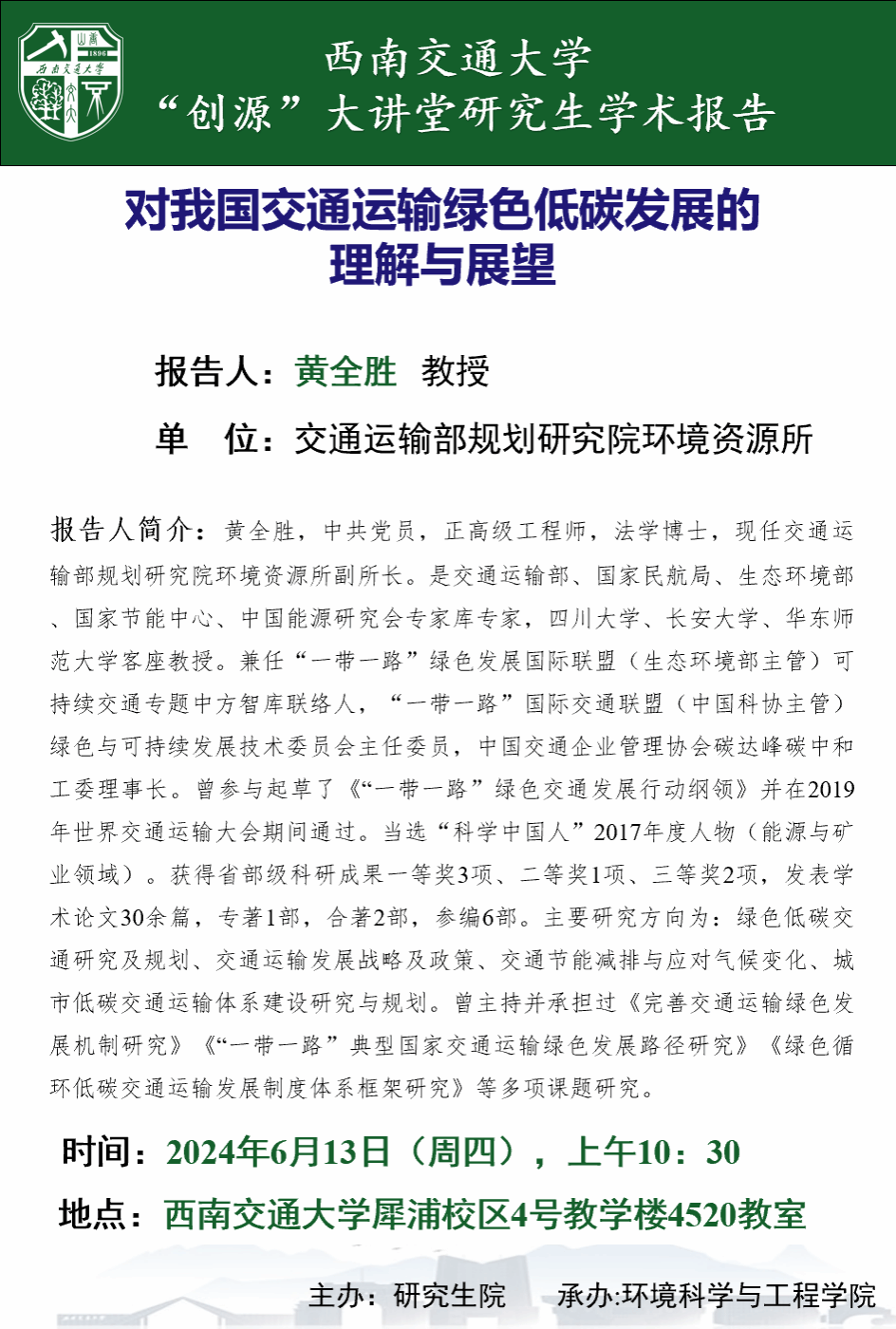 讲座主题:对我国交通运输绿色低碳发展的理解与展望