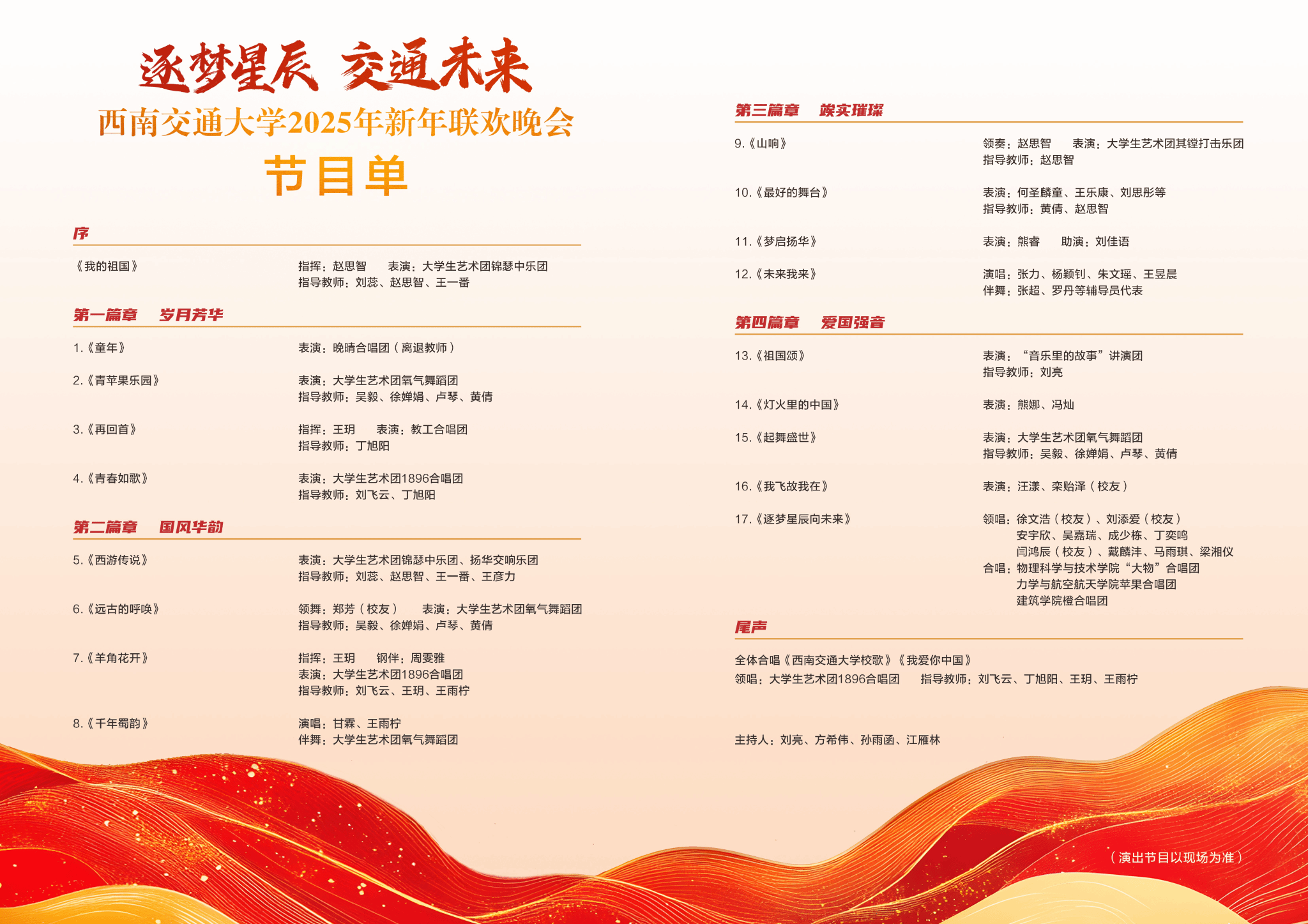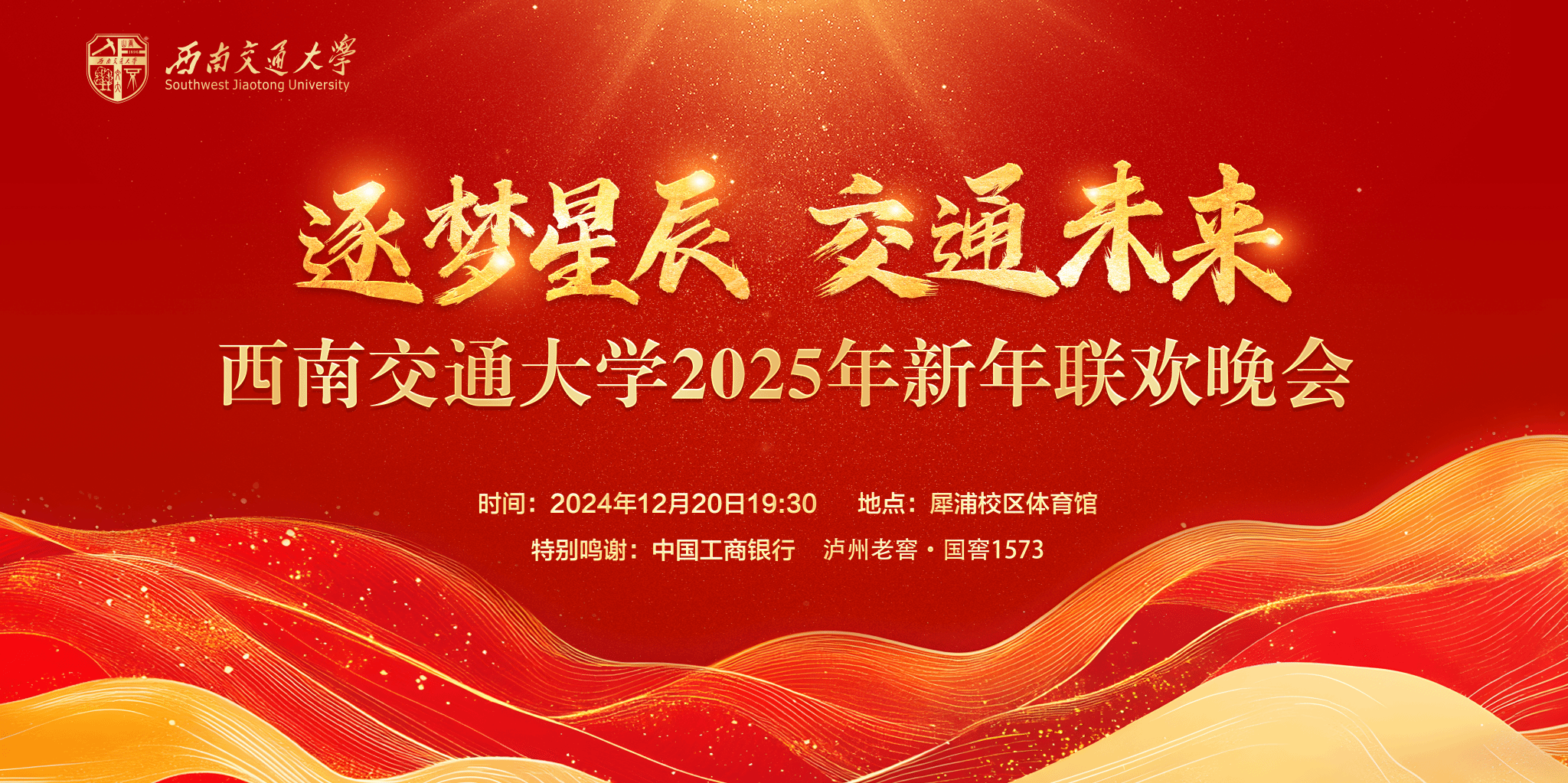 一元复始山河美,万象更新锦绣春。2024年即将结束,在这辞旧迎新之际,为营造欢乐、祥和的校园文化氛围,学校将举办“逐梦星辰 交通未来”西南交通大学2025年新年联欢晚会。诚邀全校师生员工校友观看,共同辞别旧岁,喜迎新年!