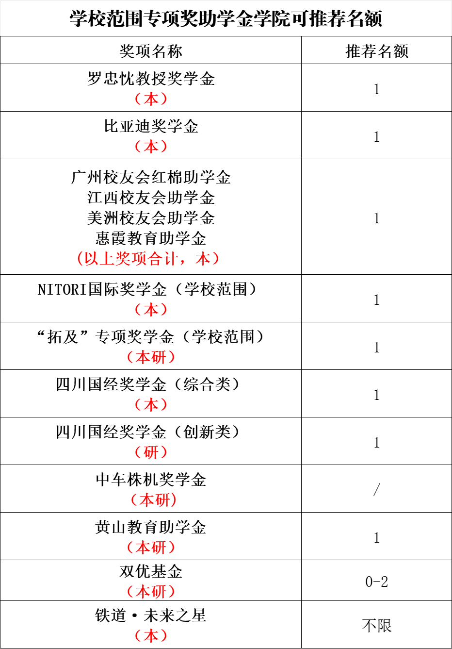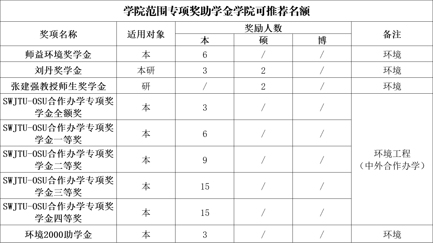 依据《西南交通大学本科生奖助学金评审管理办法》(西交校学生〔2025〕15号)(见附件1)《西南交通大学研究生专项奖助学金评审管理办法》(西交校学生〔2025〕4号)(见附件2),结合学校范围专项奖助学金评定办法(见附件3)进行申请学校范围专项奖助学金本学院内可推荐名额见上表。