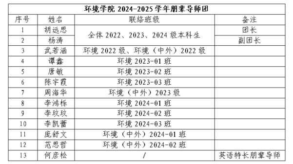 根据学生自荐环境科学与工程学院学生工作组统一资格审核,现将学院2024-2025学年朋辈导师选聘及联络对接结果公示如下