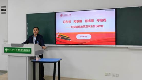 活动伊始,学校纪委副书记张国正受邀做题为《识形式、知敬畏、存戒惧、守底线》的科研诚信政策宣讲及警示教育。张国正副书记详细介绍了近年来全国反腐工作的显著成果,并通过列举部分高校在科研工作中出现的违规违纪案例,深刻剖析了科研诚信的重要性。他强调,科研诚信是科技创新的基石,必须营造一个诚实守信的科研环境,对严重违背科研诚信要求的行为实行终身追责,以此强化责任追究,增强科研人员的自律意识,让守信者得到应有的鼓励,失信者受到应有的惩罚和限制。