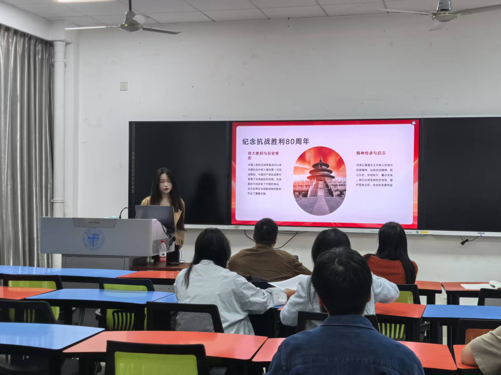 第一位分享的支部成员是汪海欣,她给大家带来的是主题为《知史爱党、知史爱国:党史与民族复兴》的内容分享。她为支部成员详细介绍了学习党史的重要性、纪念抗战胜利80周年、庆祝新中国成立76周年等相关内容。随后从“民族复兴是百年党史的主题”、“新时代的历史性成就与变革”以及“党史中的光辉典范”的相关内容展开详细介绍与分享。最后,她表明要持续加强党史学习,并以史为鉴、开创未来,呼吁每一位党员都要每一位党员都要牢记初心使命,勇于担当作为,为实现中华民族伟大复兴贡献自己的力量。