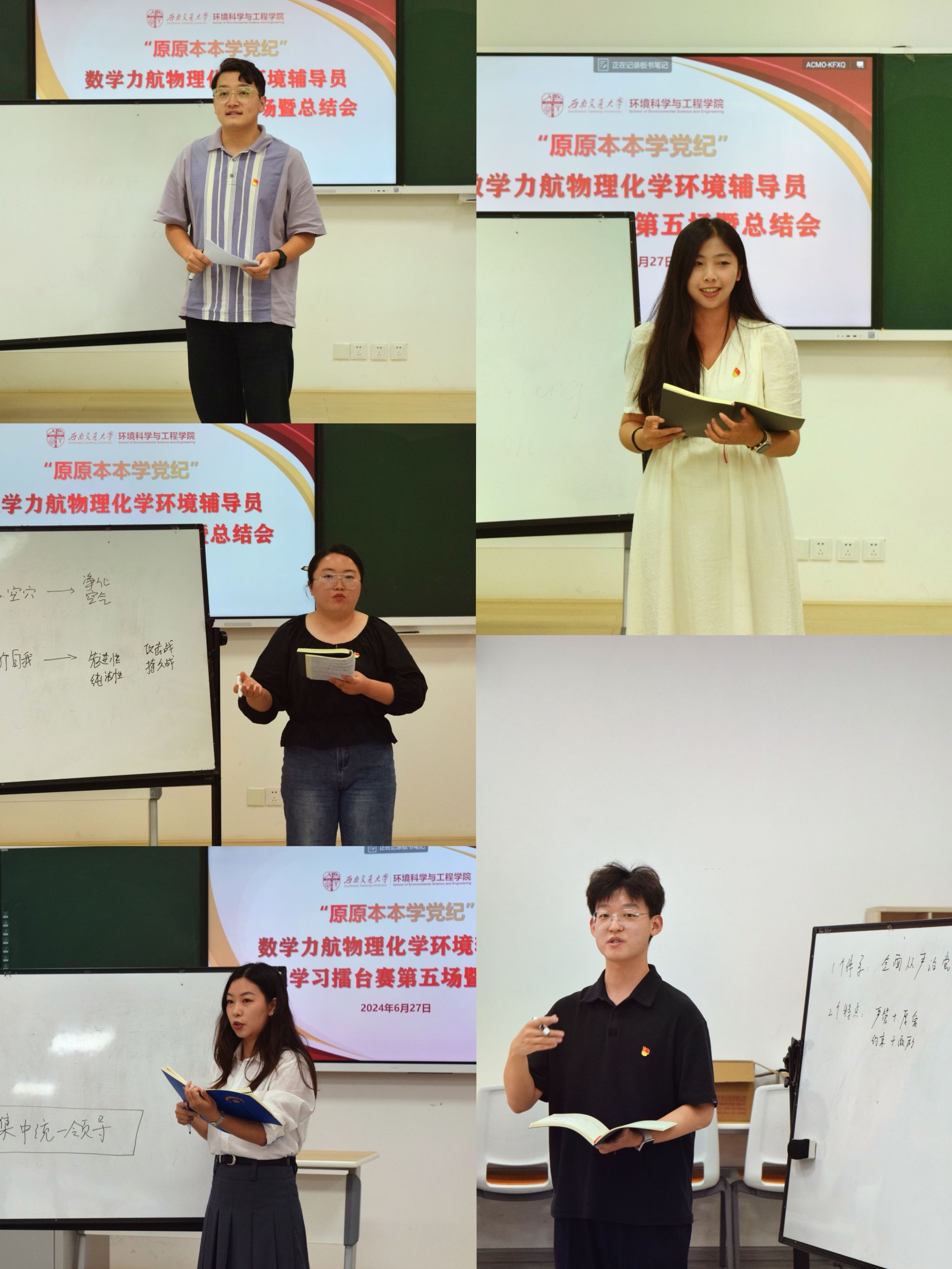 辅导员郑非、数学学院辅导员周义杰、力航学院辅导员安晟婓、化学学院辅导员何芙馨、物理学院辅导员王春蕾走上讲台,分别带领在场老师们学习习近平在党的二十大报告中有关党纪内容、习近平在二十届中央纪委二次全会上和二十届中央纪委三次全会上的讲话内容。各位老师在深刻解读、深入剖析讲话精神要义的同时,充分结合专业特色和学生工作特点,将纪律党课讲活、讲深、讲透,使在座老师们深入浅出感受维护党的纪律的重大意义,会场内响起阵阵掌声。