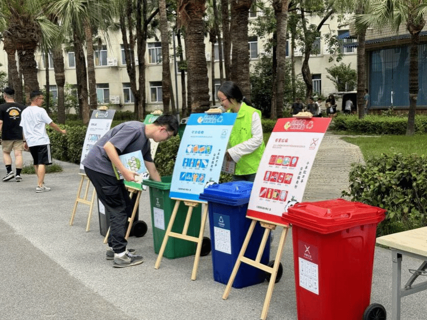上午10时,相关负责人安排下,志愿者们首先将垃圾分类的宣传牌树立起来,以不同的板块为内容依次宣传各类型垃圾的分类方法,同时以对应颜色的垃圾桶为例与往来群众进行互动,展示垃圾桶的用途和标识,让师生直观了解垃圾分类的要求,增进对垃圾分类的理解。