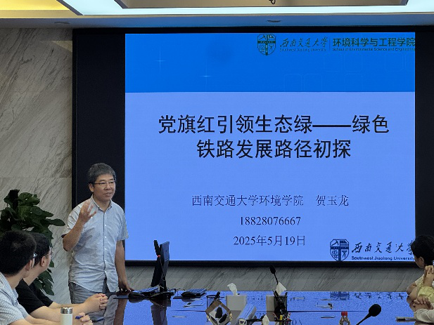 贺玉龙教授带来“党旗红引领生态绿——绿色铁路发展路径初探”的分享。贺教授详细阐释了“绿色铁路”“绿色设计”“绿色施工”“绿色铁路评价”等关键内容,以环境价值为尺度,强调运用绿色技术,在保障铁路运输安全高效的同时,降低对生态环境负面影响,推动铁路可持续发展,为与会人员打开了绿色铁路发展研究的新视野。