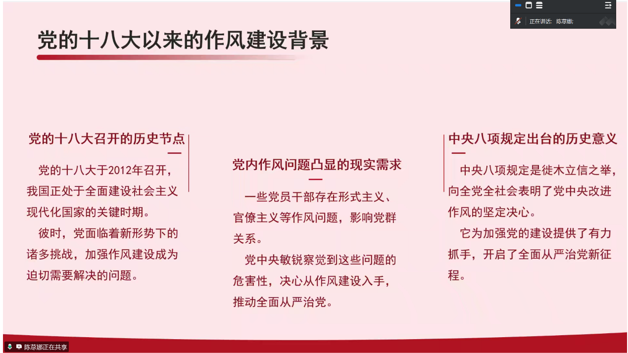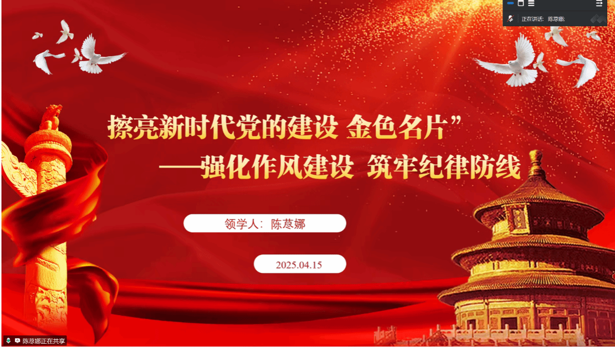 首先,陈荩娜同志以“擦亮新时代党的建设‘金色名片’”为主题展开领学,向支部成员强调了党的十八大以来,以习近平同志为核心的党中央以制定出台中央八项规定开局破题,坚持自上而下、以上率下,刹住了一些长期没有刹住的歪风,纠治了一些多年未除的顽瘴痼疾,解决了新形势下作风建设抓什么、怎么抓等重大问题。