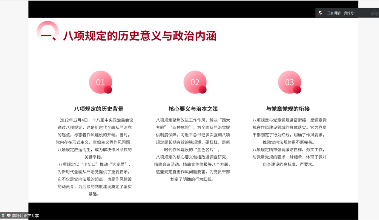 接着,龚姝月同志以“清风正气满乾坤——习近平总书记引领全党锲而不舍贯彻落实中央八项规定精神”为主题展开领学。我们紧密团结在以习近平同志为核心的党中央周围,始终把中央八项规定作为长期有效的铁规矩、硬杠杠,始终保持党同人民群众的血肉联系,始终以优良作风凝心聚力、干事创业,一定能把中国式现代化宏伟事业不断推向前进。