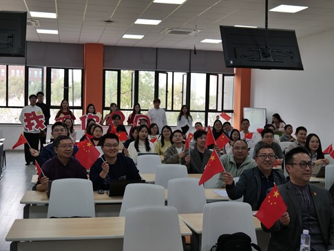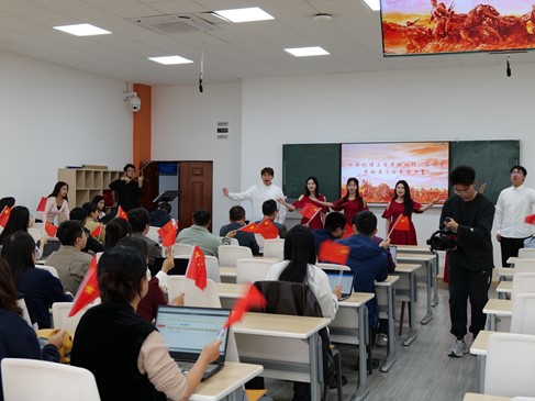 会议伊始,学院邀请了“音乐里的故事”之歌曲《国家》讲演团进行展示。从受阅官兵的飒爽英姿到汶川地震再到守边楷模的故事,讲演团以生动的故事,展现了歌曲背后的爱国情怀,迅速点燃了现场师生的热情。演唱组用清澈深情的歌声,倾情演绎了歌曲《国家》,达到了动听、动情、动人的艺术思政教育效果。全院教师随着歌声挥舞国旗,共同抒发对祖国的无限热爱和对民族的深情厚意,为大会营造了浓厚的爱国主义氛围。表演结束,老师们反响热烈,纷纷表示讲演团的活动通过故事的生动性和音乐的感染力,潜移默化地向我们传递了爱国主义主题,证明了艺术在思想教育方面所能发挥的独特作用,更是激发了全体老师对国家与民族深沉的爱与责任,为同学们的表演点赞!