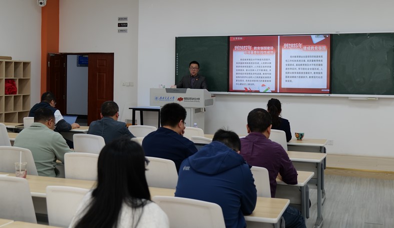 接着,学院党委书记甘霖向全体教职工传达了 2025 年全国两会精神以及《教育强国建设规划纲要(2024 - 2035)》的主要精神。甘霖书记从多个方面对两会精神进行了系统阐述,重点解读了教育领域相关的政策导向和发展目标。同时,结合《教育强国建设规划纲要(2024 - 2035)》的内容,深入分析了学院在教育强国建设中的定位与使命,强调了学院在人才培养、科学研究、社会服务等方面的重要作用,鼓励全体教职工积极投身教育强国建设的伟大事业中,为实现国家教育发展目标贡献自己的力量。