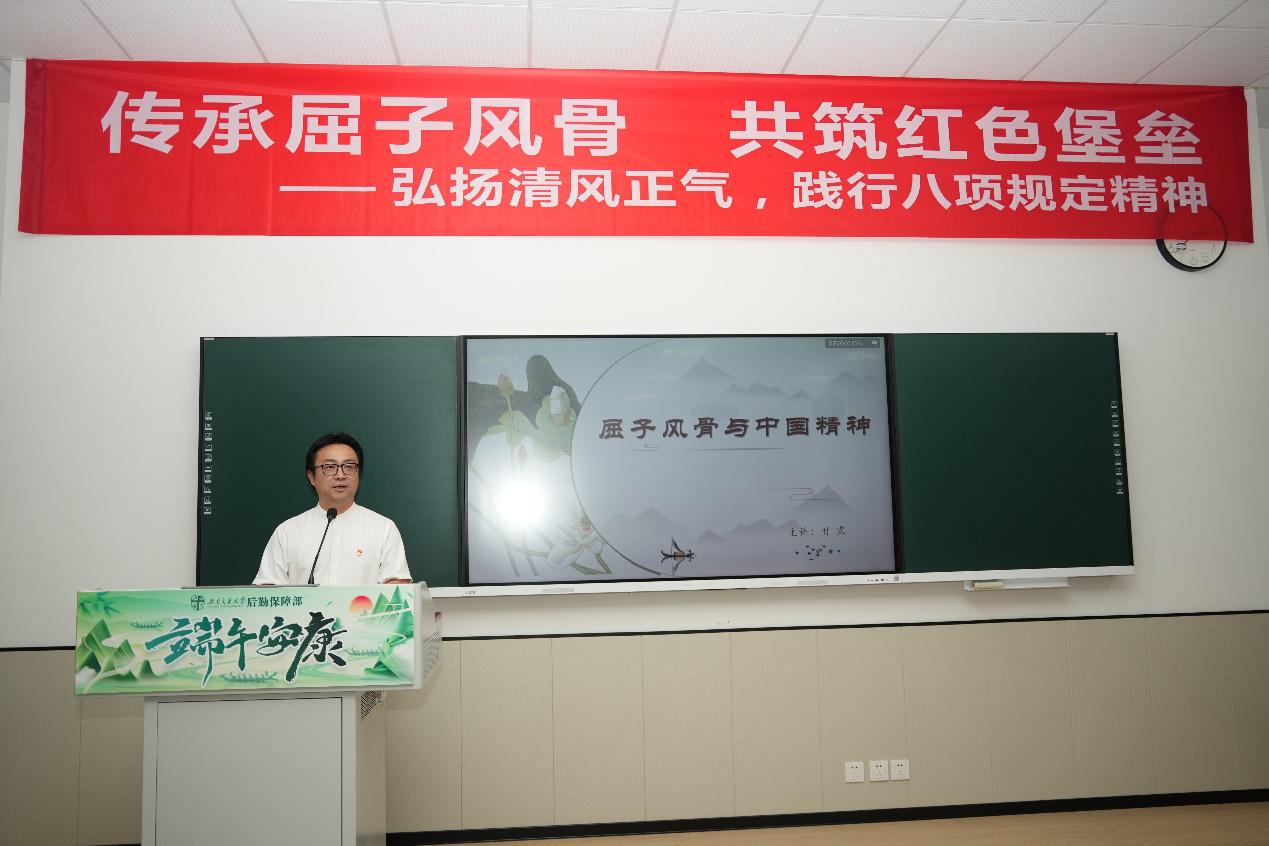 党委书记甘霖以《屈子风骨与中国精神》为题讲授微党课。他以屈原生平与《楚辞·橘颂》创作为脉络,结合新时代国家发展成就,解读中国精神的丰富内涵,阐释了屈原作品中“深固难徙,廓而无求兮”的坚守初心、“闭心自慎,终不失过兮”的自律品格、“淑离不淫,梗其有理兮”的刚正气节,以及“行比伯夷,置以为像兮”的廉洁风范。
