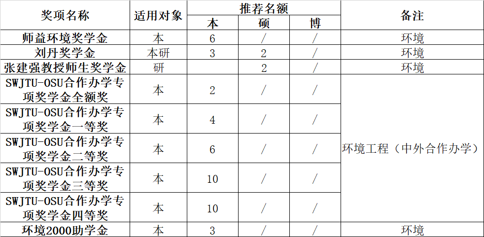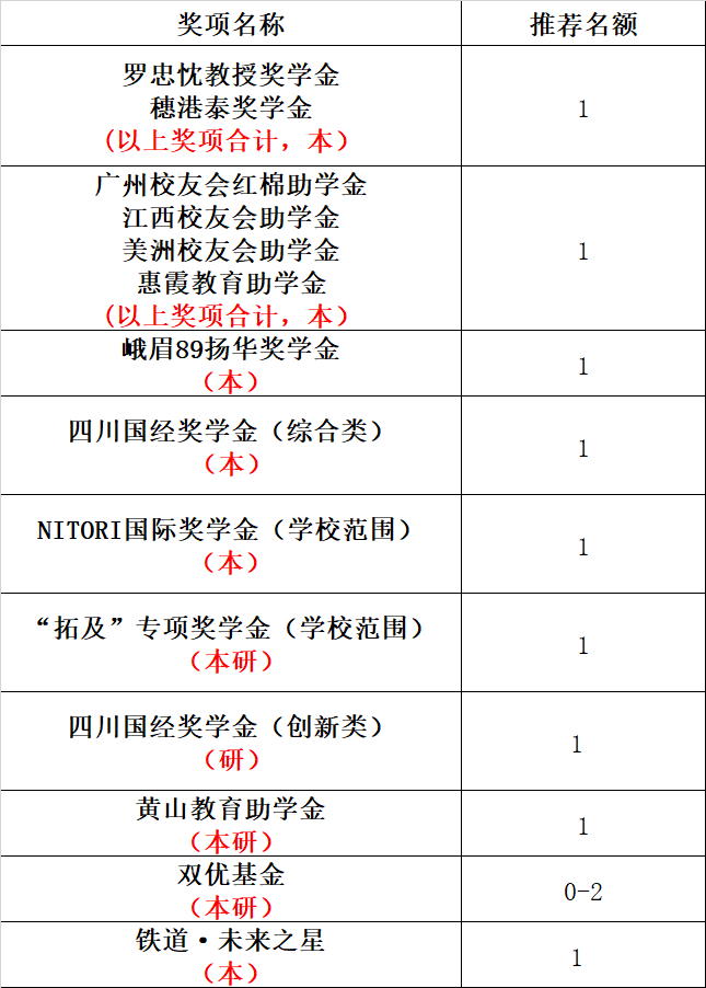 依据《西南交通大学本科生奖助学金评审管理办法》(西交校学生〔2023〕4号)(见附件1)《西南交通大学研究生专项奖助学金评审管理办法》(西交校学生〔2023〕9号)(见附件2),结合学校范围专项奖助学金评定办法(见附件3),面向学生做好相关宣传工作,登录扬华素质网“奖助学金评选”版块开启学院本研评选批次(批次名称分别为:2023-2024学年学校范围专项奖助学金评选(本科)、2023-2024学年学校范围专项奖助学金评选(硕士 博士)。学院学校范围专项奖助学金可推荐名额见上表。