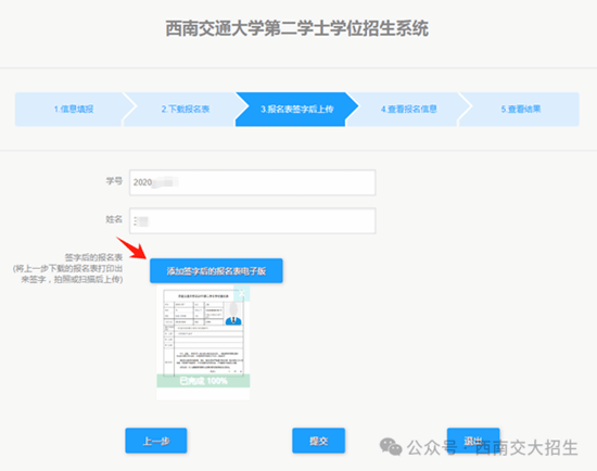 上传报名表:《西南交通大学2024年第二学士学位报名表》在承诺人处签字后,拍照或扫描为清晰照片,点击“添加签字后的报名表电子版”进行上传,上传成功后点击“提交”完成报名。