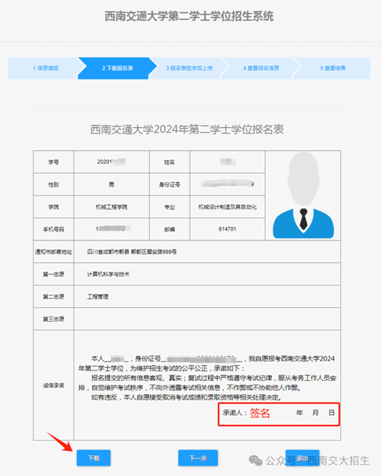 下载报名表:再次检查填报信息无误后,点击“下载”,完成下载并打印《西南交通大学2024年第二学士学位报名表》,在承诺人处签字。最后点击“下一步”,进入报名表上传页面。
